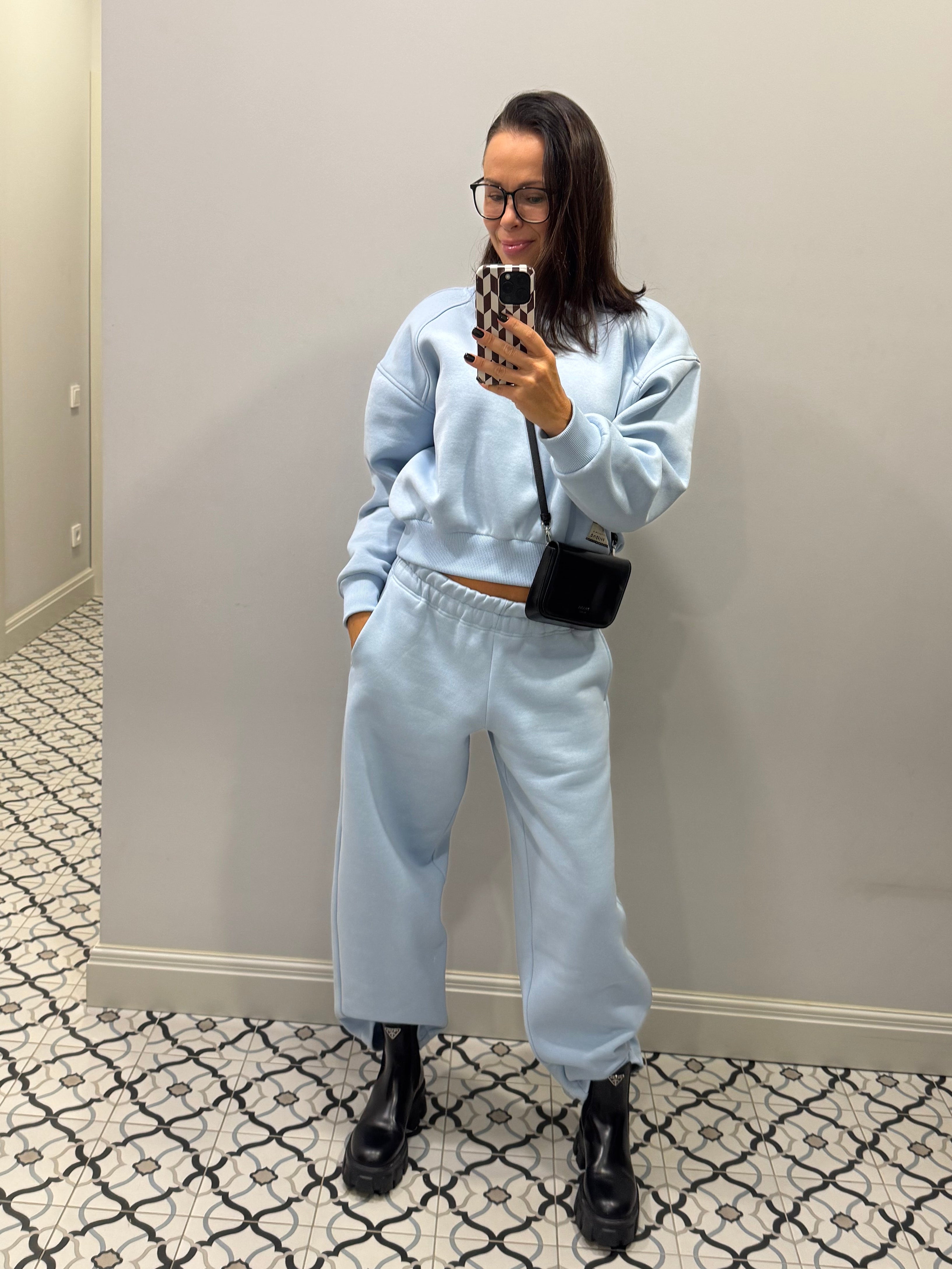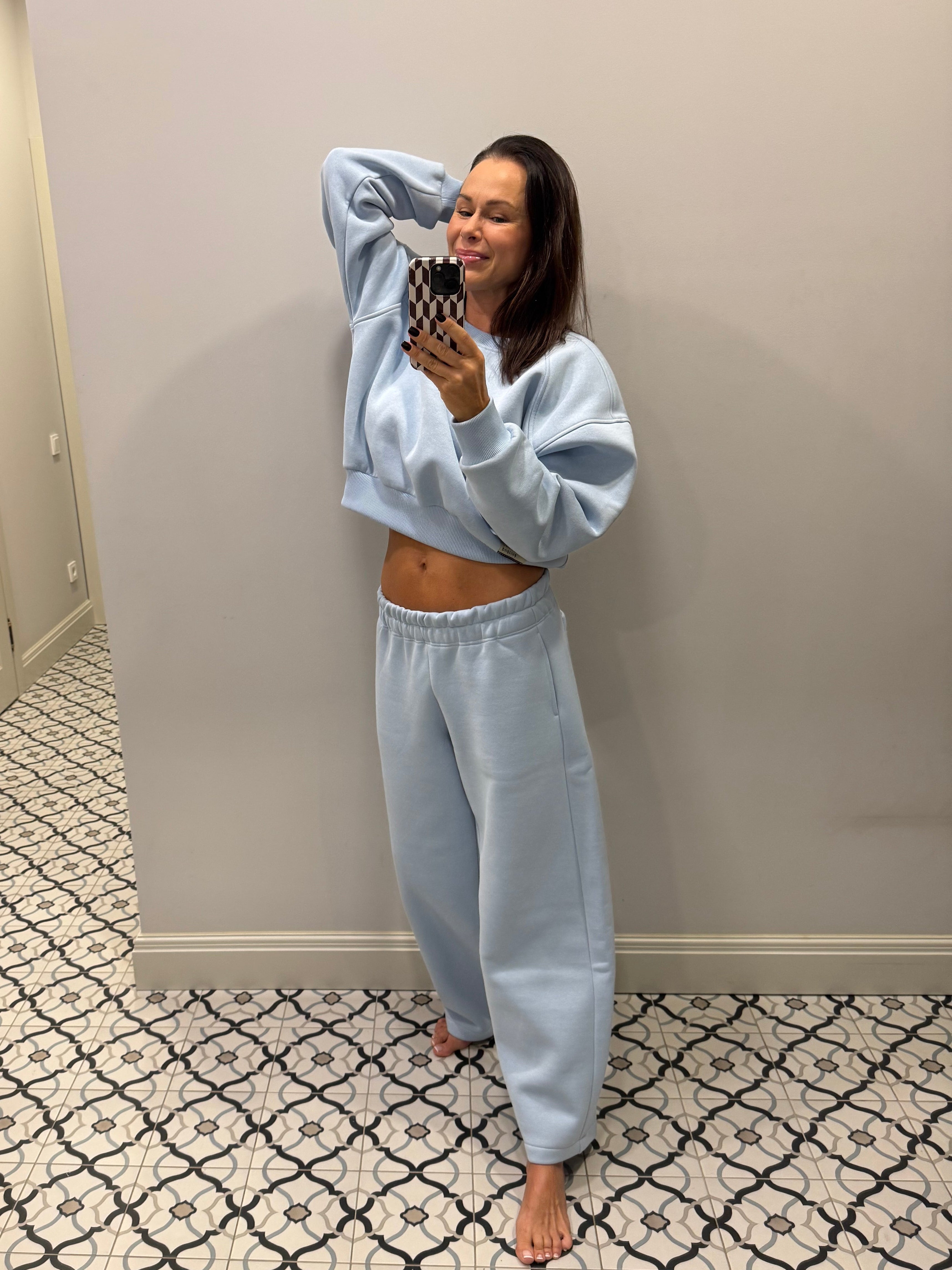 Sweatshirt with shoulder pads and loose fit pants, with fluff